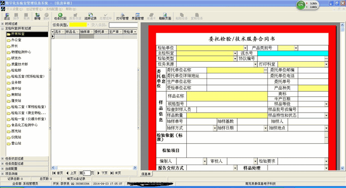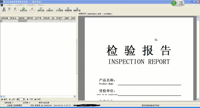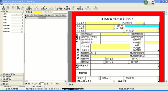 1、抽样单或委托单使用平板填写(如果有网络数据即刻进入服务器,没有网络的话回到单位连通WIFI数据自动传入服务数据),便携式打印机套打盖了单位公章的空白抽样单或委托服务单,