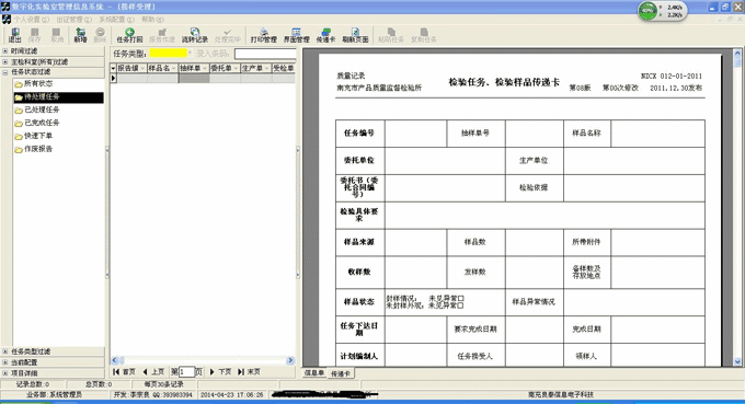 2、大厅接样人员使用手机、平板或专业的手持条码设备接收真实样品并审核数据,实验室任务分派员手机接收到推送信息。此流程节点为:接样完成。